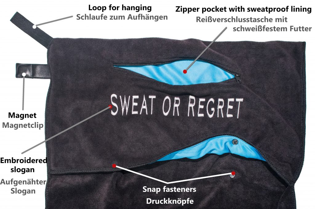 Integrierte 25 cm Reißverschlusstasche mit einem blauen, schweißfesten Futter.